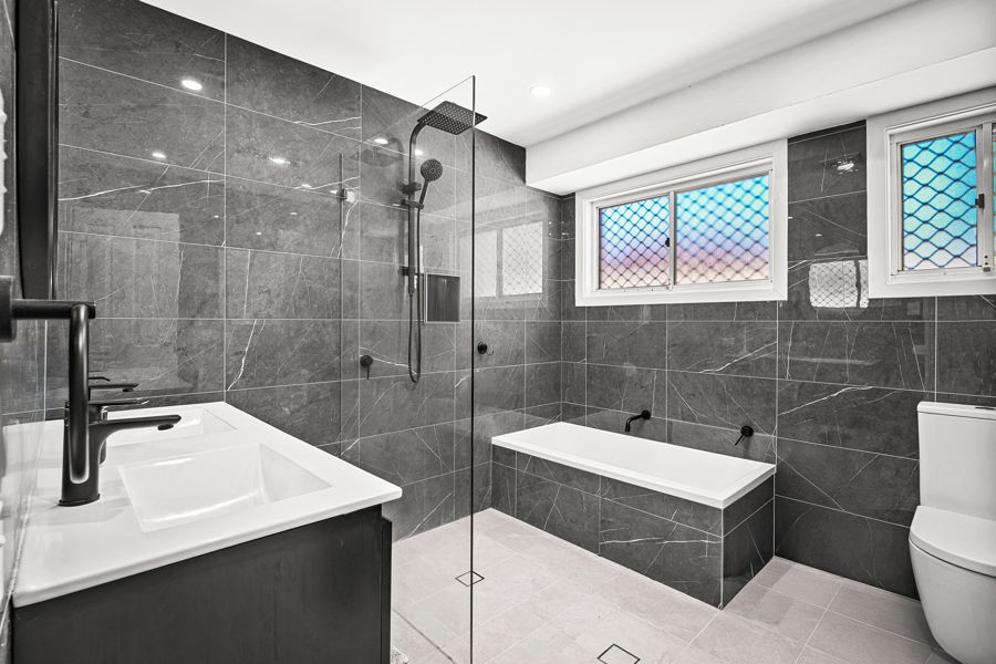 - Modern full bathroom tiled-to-ceiling with shower, bathtub, his & her vanity & toilet
