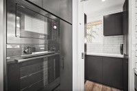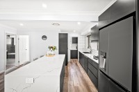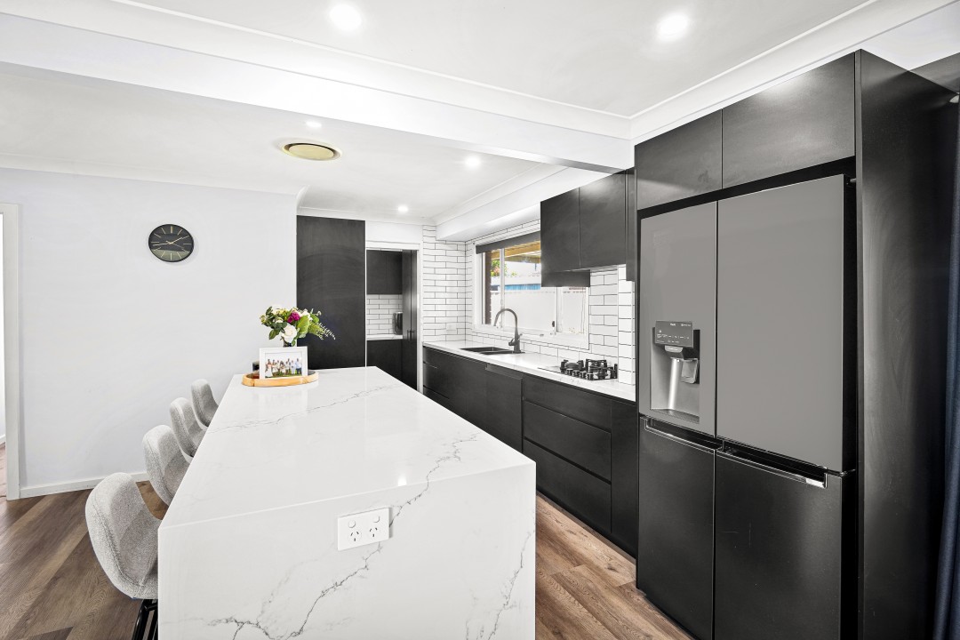 - Modern kitchen with gas cooktop, stone benchtops, breakfast island, tiled splash back, steel appliances, ample cupboards for storage