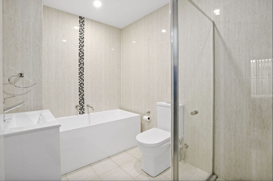 - Modern good size full separate bathroom tiled to ceiling with bath tub & shower screen