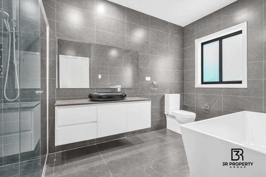 - Modern master ensuite bathroom tiled to ceiling with his & her basin & shower