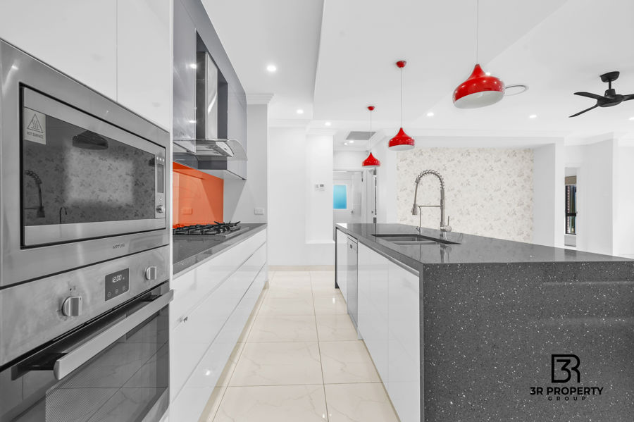 - Modern kitchen with stone benchtop, island, gas cooktop, tiled splash back, ducted range hood, dishwasher, built in microwave, steel appliances and ample cupboard storage
