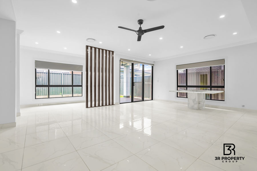 - Oversized open plan lounge & dining room with tiled flooring, ceiling fan & access to backyard
