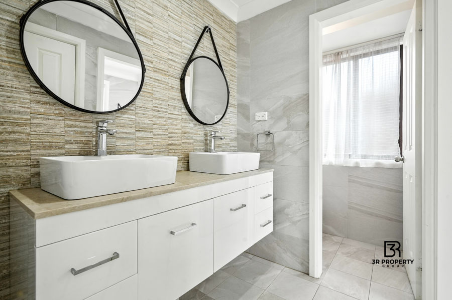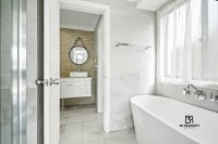 - 2 way modern bathroom tiled to ceiling with bathtub, shower & niche, separate toilet, separate his & her basin & linen cupboard for additional storage