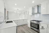 - Huge modern kitchen with stone benchtop, breakfast bar, gas cooktop, tiled splash back, dishwasher, ducted rangehood, pantry, steel appliances & ample cupboard storage
