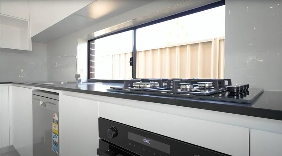 - Spacious modern kitchen with gas cooktop, dishwasher, tiled splash back, near new appliances & ample cupboard storage
