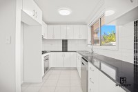 - Generously sized modern kitchen with gas cooktop, stone benchtop, tiled splash back, dishwasher, ducted rangehood, steel appliances & ample cupboard storage